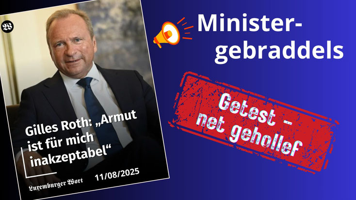 De Finanzminister Gilles Roth (CSV) huet am Summerinterview mam Télécran e Saz gesot, deen esou glat ass wéi säin Déngschtwon: "Aarmut ass fir mech inakzeptabel." Bravo, Gilles. D’Welt huet op dëse Moment gewaart. D’Armutsbekämpfung ass geléist – mat engem Saz.