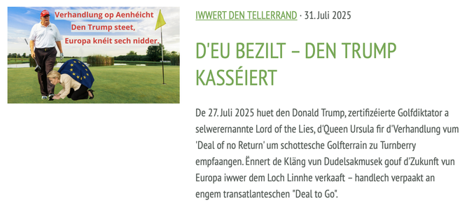 Insider munkelen, dem neie Luc géif et drëm goe, seng Parteikolleegin Ursula von der Leyen ze decken, déi de 15%-Deal am Juli 2025 am Hauruckverfaren mam Donald Trump op engem schottesche Golfterrain ausgehandelt huet.