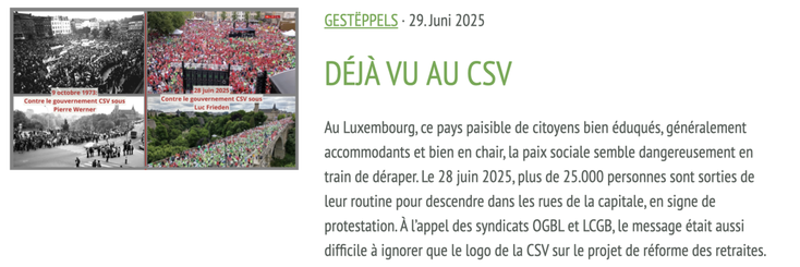 «J’ai essayé de les garder dans la salle jusqu’à ce qu’ils disent oui à tout. Ça n’a pas tout à fait marché, mais au moins ils sont restés. Et ça, c’est déjà une belle réussite. Ils avaient l’air épuisés. Faut dire qu’ils ne sont pas habitués aux heures supplémentaires.» (Luc Frieden, 10 juillet 2025 – CSV-Summerfest)