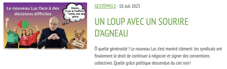 Luc Frieden a déclaré par la suite que ses propos offensants à l’égard des syndicats lors de la fête d’été du CSV n’étaient qu’une «blague». Une blague, donc. Le Premier ministre en humoriste de stand-up. Peut-être que, pour le nouveau Luc, les discussions avec les syndicats et le patronat relevaient d’un nouveau late-night-show. Dommage pour lui: les applaudissements se sont fait attendre — et sur les réseaux, il a été flambé à vif.